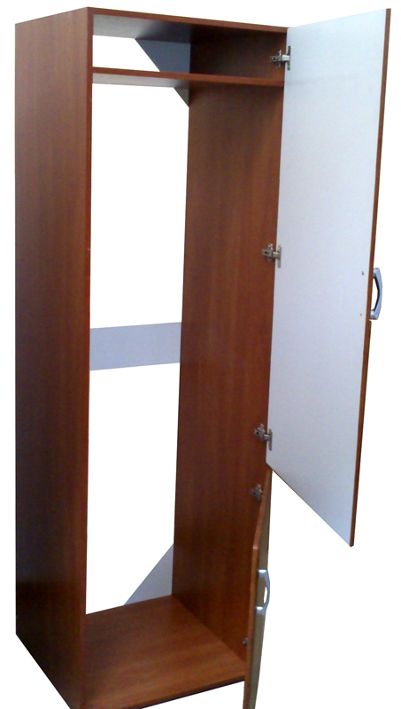 Skříňka je vysoká 208 cm včetně ratifikačník nožek 10 cm, které bezvadně vyrovnávají nerovnosti podlahy. I s dvířky nepřesáhne celková hloubka skříňky 58 cm. Dvířka jsou z matné MDF, tedy fólie na dřevovláknité desce tloušťky 16 mm nebo 18 mm. Povrch dvířek, kromě vzhledu a možnostem výběru barev, vyniká také dlouhou životností a snadnou údržbou. Korpus skříňky je vyrobený z laminované dřevotřískové desky. Hrany skříňky jsou opatřeny systémem ABS, který je chrání před vlhkostí a mechanickým poškozením.